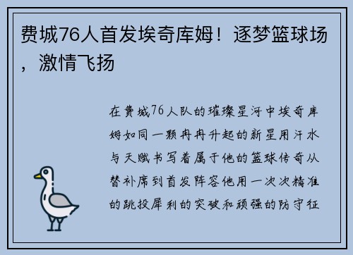 在费城76人队的璀璨星河中,埃奇库姆如同一颗冉冉升起的新星,用汗水与天赋书写着属于他的篮球传奇。从替补席到首发阵容,他用一次次精准的跳投、犀利的突破和顽强的防守征服了球迷,也重新定义了球队的未来。...
