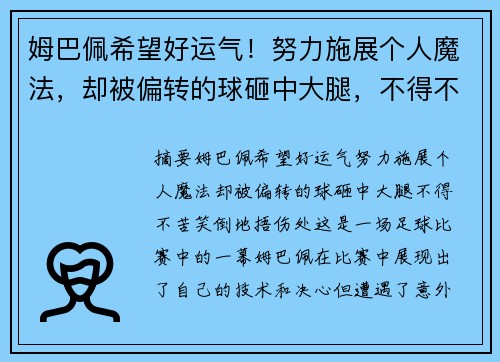摘要:姆巴佩希望好运气!努力施展个人魔法,却被偏转的球砸中大腿,不得不苦笑倒地捂伤处。这是一场足球比赛中的一幕,姆巴佩在比赛中展现出了自己的技术和决心,但遭遇了意外的伤病。本文将从比赛开局、姆巴佩的努...
